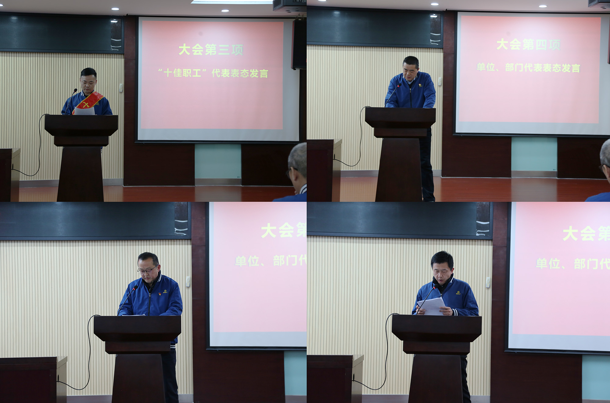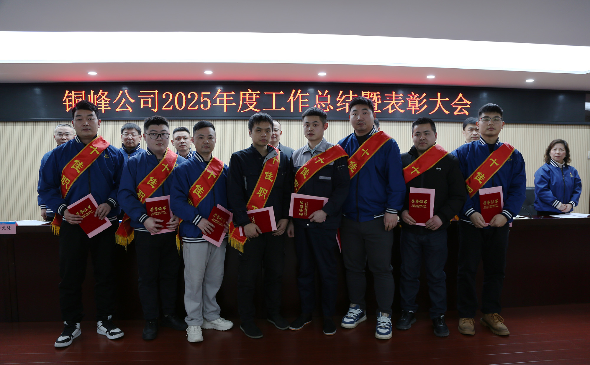 與會(huì)領(lǐng)導(dǎo)為受表彰的2025年度公司“十佳職工”頒發(fā)榮譽(yù)證書(shū)及獎(jiǎng)金?!笆崖毠ぁ?、經(jīng)營(yíng)單位和職能部門(mén)代表分別作表態(tài)發(fā)言。